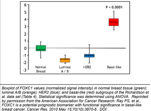 FOXC1 is significantly over expressed in BLBC compared to other subtypes of breast cancer (P value < 0.0001).